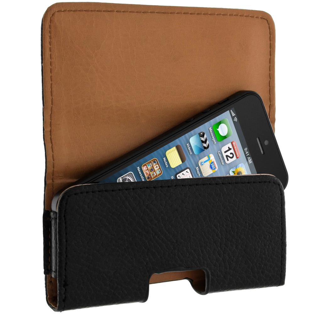 Custodia cintura similpelle nera interno caffe per smartphone. Un apposito sistema a gancio sul retro permette di fissarsi alla cintura in modo da lasciare le tasche libere.