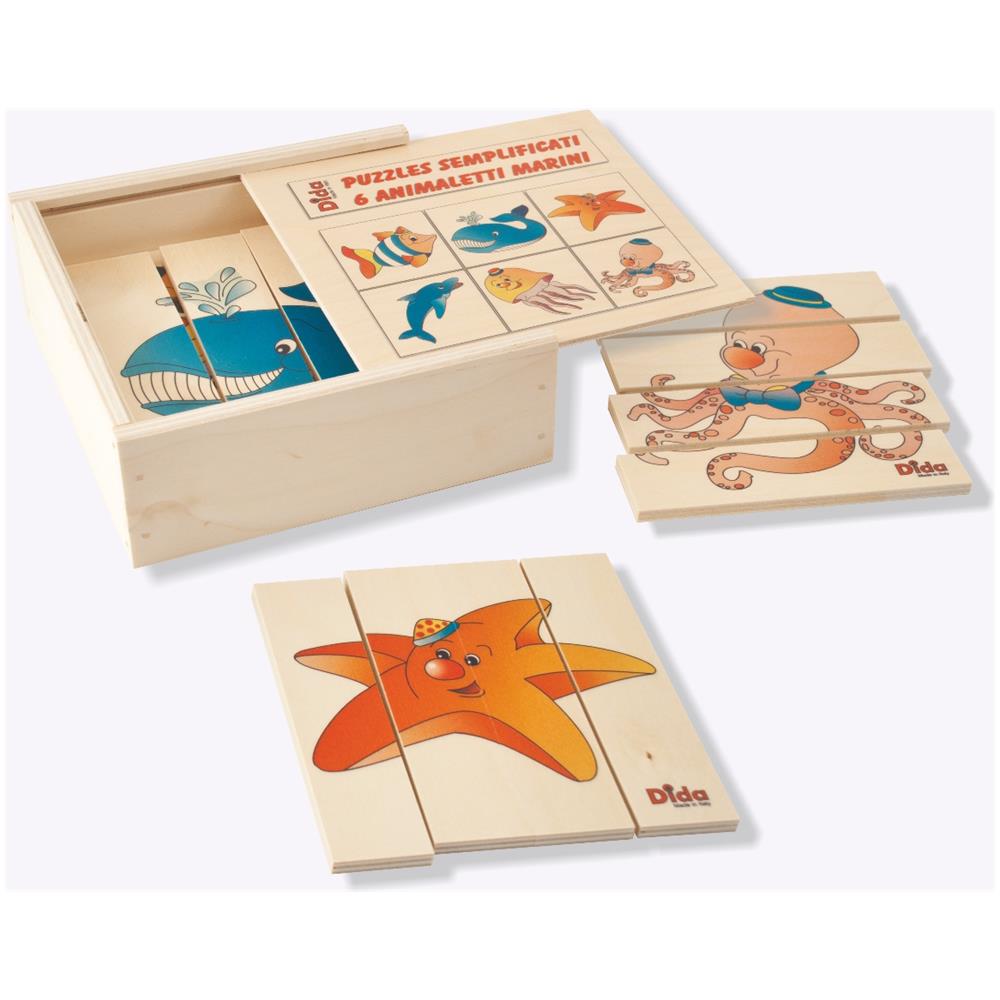 "Un set di facili puzzle da ricomporre. Ci sono sei simpatici animaletti, ognuno dei quali suddiviso in 4 tessere e il bimbo si divertirà a creare il suo piccolo zoo marino personale.