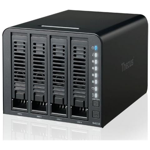 Thecus N4310. Capacità  totale di archiviazione installata: 0 GB, Tipi di Unità  di archiviazione supportate: HDD, SSD, Capacità  massima di archiviazione supportata: 0 TB. Famiglia processore: AMCC PowerPC, Frequenza del processore: 1 GHz. RAM interna: 1 GB, Tipo di RAM interna: DDR3. Tipo di case: Mini Tower, Colore del prodotto: Nero. Modello: NAS, Classe del dispositivo: Small & Medium Busi...