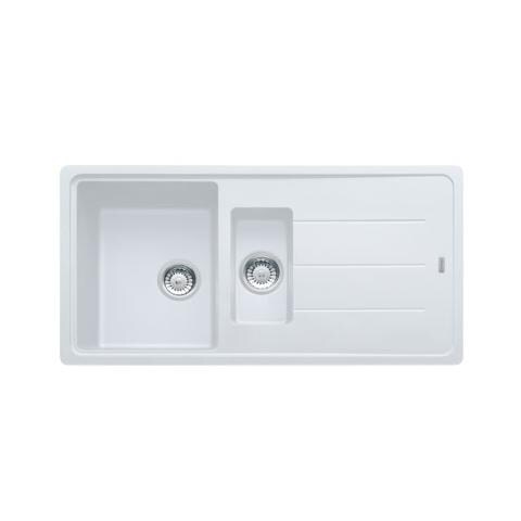 Lavello in fragranite a 2 vasche, di cui 1 vaschino, gocciolatoio reversibile e con bordo standard. Dimensioni (LxP) 97 x 50 cm, dimensioni incasso (LxP) 96 x 48 cm. Colore: Bianco