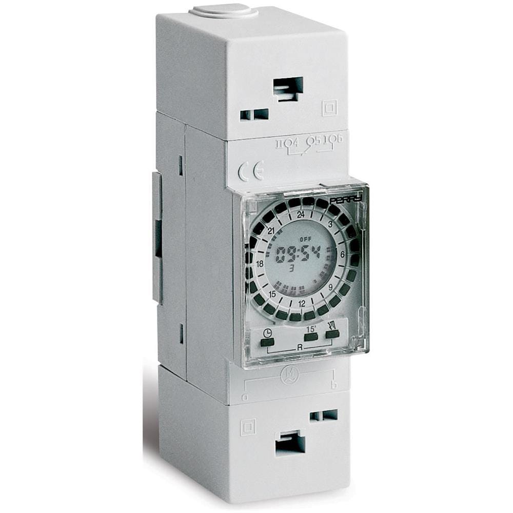 Interruttore orario digitale perry 1io 0024 / d15 a cavalieri settimanale con riserva di carica max 15 giorni 2 din 1 contatto in deviazione libero on / off minimo 15 minuti montaggio a parete e su barra din ed a retroquadro con apposito accessorio opzionale