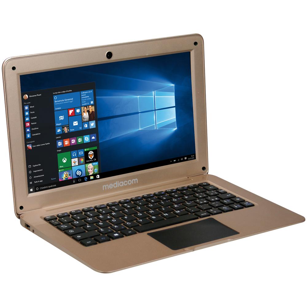 Notebook SmartBook 11 con Processore : Intel Atom Z3735F Quad Core, 1.33 GHz. Ram : 2 GB. Storage : 32 GB SSD (Solid State Disk) . Porte USB : 2 x 2.0. Sistea operativo : Windows 10 Home. Monitor da 10.1" IPS LED con risoluzione 1366x768 HD. Fotocamera ed altoparlanti incorporati. Colore oro.