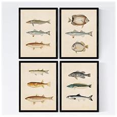 NACNIC - Set Di 4 Stampe Di Effetto Di Pesce Colorato Composizione Di 12 Pesci Diversi In Vecchia Carta Poster Della Priorità Bassa Senza Cornice A4
