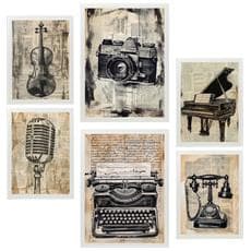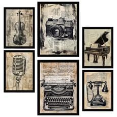 NACNIC - Set Di 6 Stampe Vintage Love Camera Microfono Pianoforte Violino Telefono Con Illustrazioni Di Design Per Casa Stanze Negozio E Attività Commerciale A3 & A4 Senza Cornice