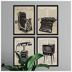 NACNIC - Set Di 4 Stampe Vintage Telecamera Per Foto, Telefono E Televisione Con Definizione Foto, Emozioni, Amicizia E Comunicazione 250 G Cornice Nera A4