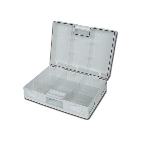 Costruita in robusto ABS trattato e facile da pulire. Tenuta ermetica garantita da guarnizione in neoprene. Dotata di supporto per attacco a parete, 2 separatori trasparenti e chiusura con clips rotanti. Vuota. Produzione italiana. CND: T0203