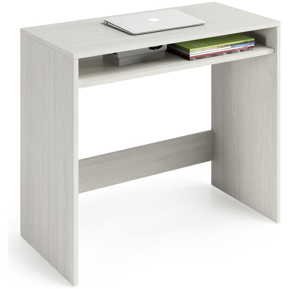 Scrivania con ripiano fisso portaoggetti sotto al tavolo interamente di colore bianco alpes, con effetto legno chiaro levigato. Pratica scrivania da collocare in un ambiente casalingo per il lavoro da casa o nella stanza dei bambini per lo studio. Il vano che si crea sotto al tavolo permette il collocamento ordinato di tutti gli oggetti necessari sia allo studio che al lavoro. Le sue linee semp...
