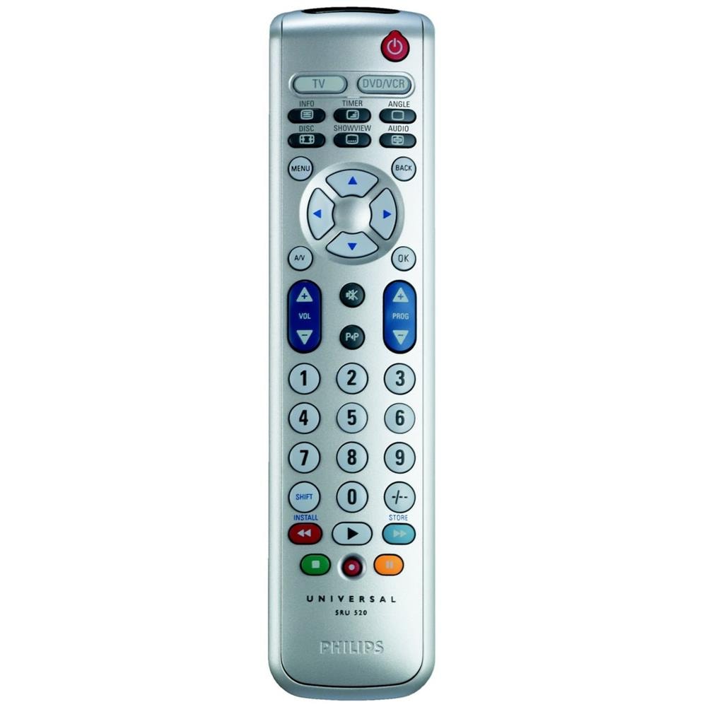Philips SRU520. Colore del prodotto: Grigio, Utilizzo appropriato telecomando: TV, VCR. Tipo di ingresso: Pulsanti. Raggio di funzionamento massimo: 7m. Angolo di trasmissione: 90. Tipo batteria: AAA